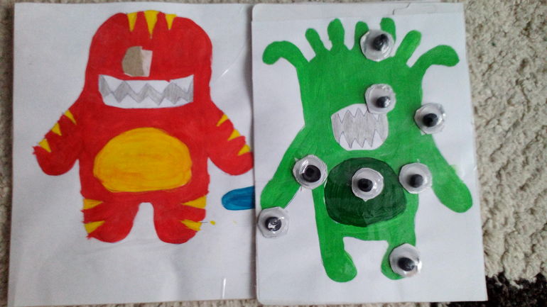 -Это игра тоже особенно понравилась. Приклей глазки для монстрика. Глазки делала сама из блистера от таблеток и кусочков пластилина. Идея Веры.