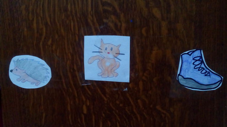 - Дима любит срывать изоленту, скотч. Воспользовалась таким интересом, искали кто прячется за стулом, деревом. То есть, на доску приклеила рисунки предметов (у нас - ботинок, кошка, еж). Эти рисунки сверху заклеила скотчем. Дальше накладывала лист с деревом на бумаге, изоленту и изображение стула на фольге. В этих рисунках (кроме изоленты) делала небольшую прорезь. Дима колупал пальцем и разрывал картинку, под которой кто-то или что-то "пряталось")))