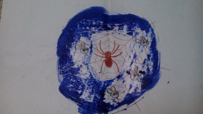 Я предложила Димке такую идею, исходя из его интересов. Паук и мухи. "В паутину к пауку попались мухи. Но ночью их совсем не видно. Дима, отыщи мух, помоги пауку". Фото - это уже результата Диминых стараний. Мухи замазаны были синей гуашью. У Димы практически не получилось выполнить задание)) Но он был очень заинтригован!