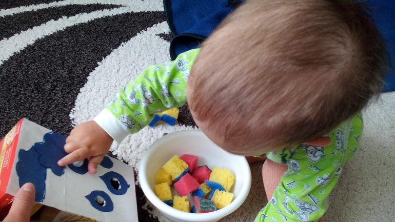 -Часто делаю всякие игры по принципу "положи в кармашек". Поскольку это действие очень тяжело у Димы осваивается. Здесь идея была такой, в "домиках" живут животные/насекомые. Найди пару и вложи в кармашек. Идея Диме нравится, но начинает дико беситься, если не получается, читай, всегда. В результате всё летит в тартарары)))