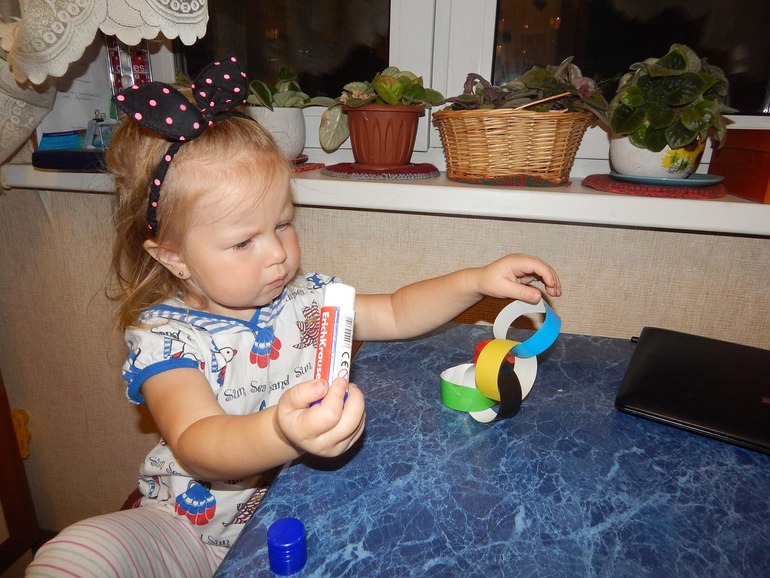 После игр с карточками мы плавно перешли к теме Олимпиады. Рассказала малышке историю возникновения олимпийских игр и познакомила с эмблемой - олимпийскими кольцами, заодно повторили цвета) Смастерили олимпийские кольца из цветной бумаги и слепили "золотую медаль" из пластилина, украсили крупами)