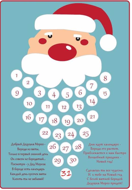 Самым маленьким можно предложить ежедневно приклеивать комочек ваты к бороде Деда Мороза