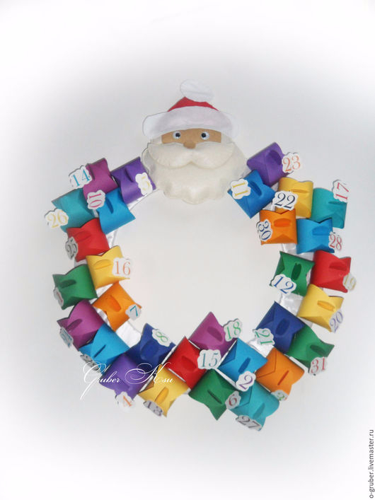 Адвент-календарь можно сделать в виде венка, украшенного Дед Морозом и коробочками с заданиями