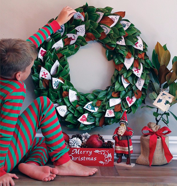 Можно купить готовый адвент-календарь и ежедневно наклеивать елочные игрушки на елку.