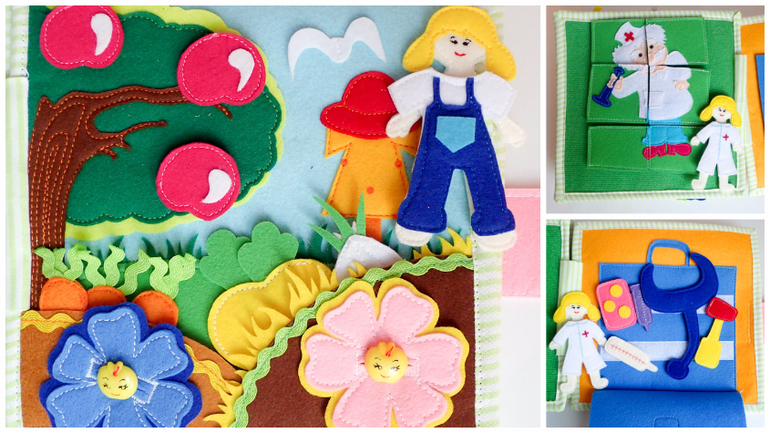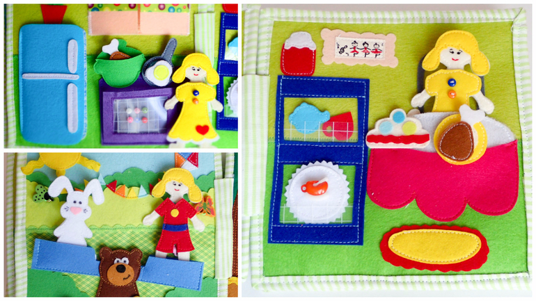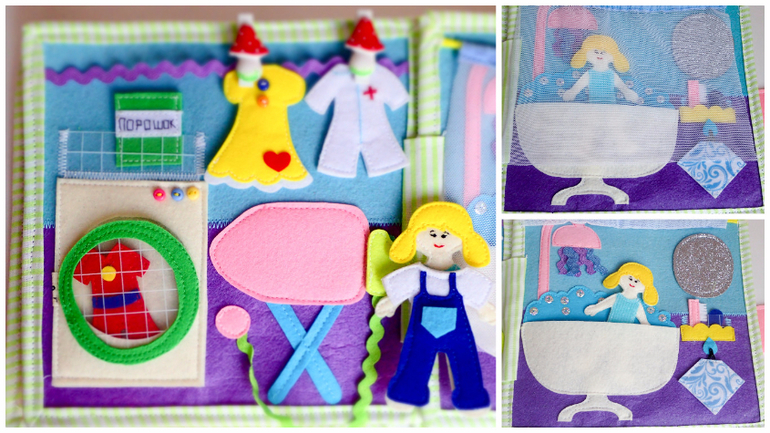 Получилось 12 страничек и более 50 съемных элементов. Все, что окружает нас в повседневной жизни собрано в домике: спальня, гардероб, кухня, ванная, игровая площадка, огородик и даже так любимые девчонками элементы больнички