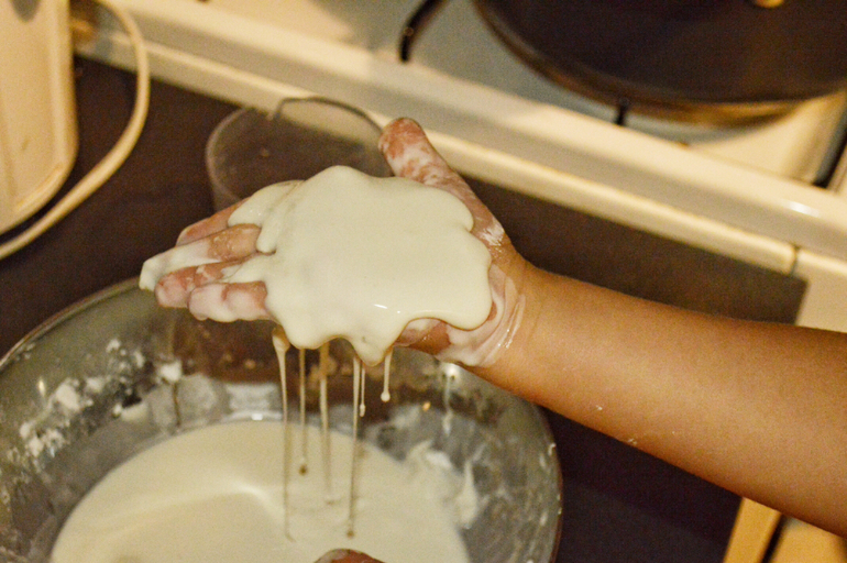 И еще опыт. Простой, но грязнючий)) чтобы устранить ненужные хлопоты по уборке, стоит заранее подстелить на стол бумагу. В миску насыпаем крахмал и разбавляем его водой. Я делаю на глаз. Получаем так называемую "неньютоновую жидкость"-жидкость, которая не подчинена законам природы. Если ее сжимать, становится твёрдой. Как только разжать кулачок-будет стекать по ладошке .
