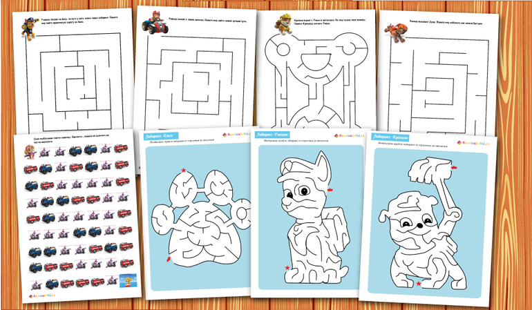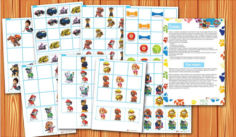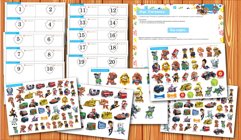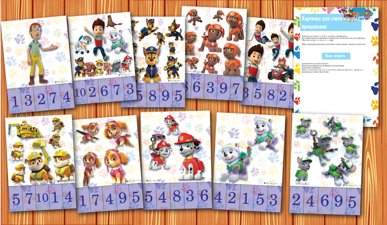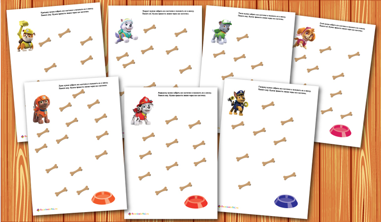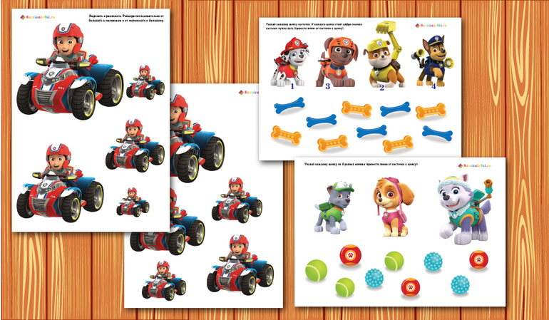 Разложить последовательно Райдера от большого к маленькому и от маленького к большому. "Раздать" щенкам столько косточек, сколько указано около них.