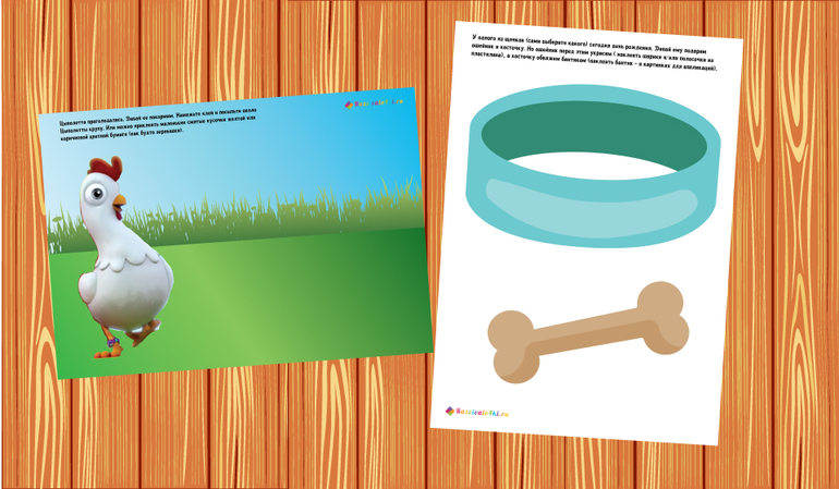 "Накормить" Цыполетту крупой. Сделать подарок для щенка: украсить с помощью пластилина ошейник и приклеить на косточку бантик.
