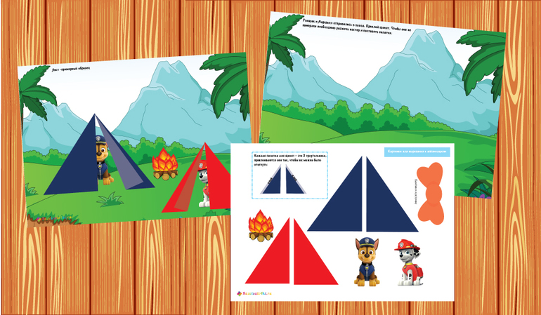 Аппликации. Помочь щенкам "развести" костер и установить палатки.