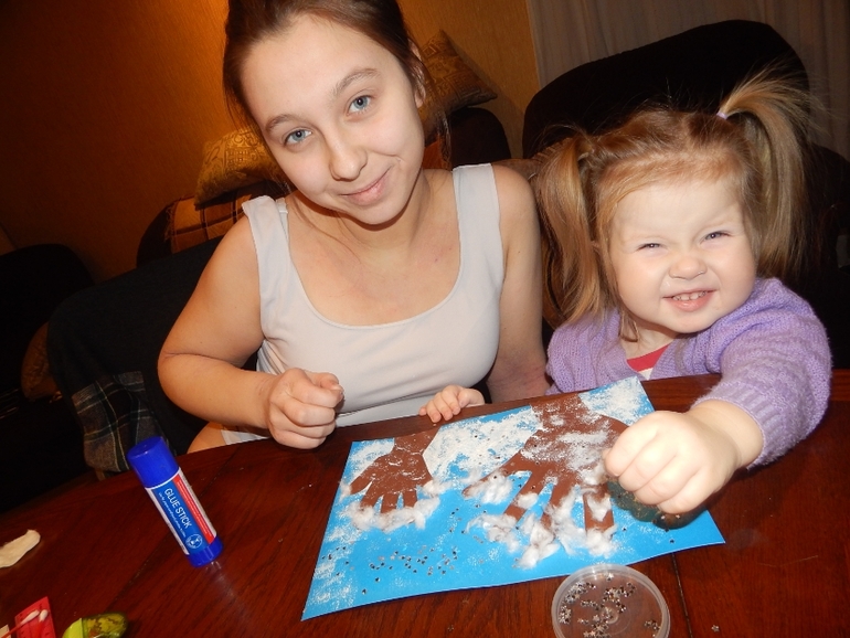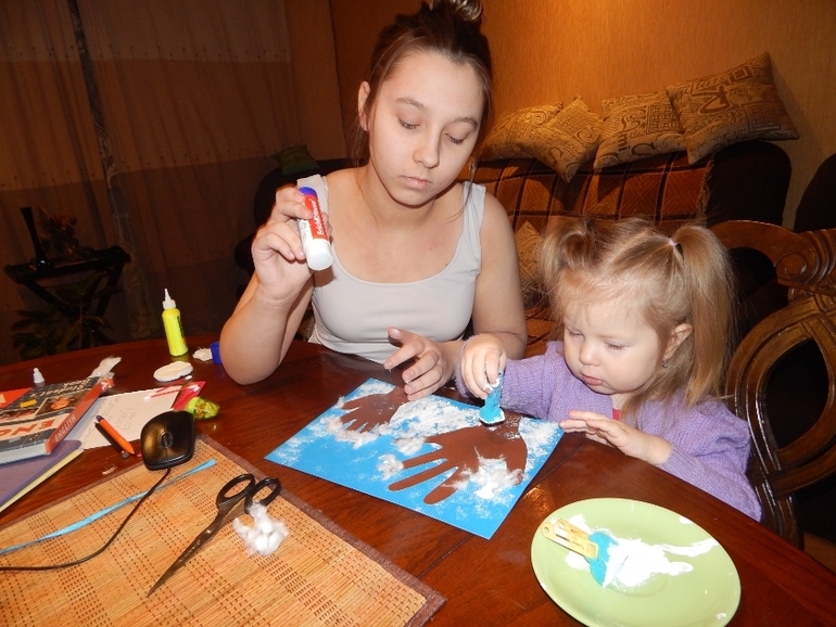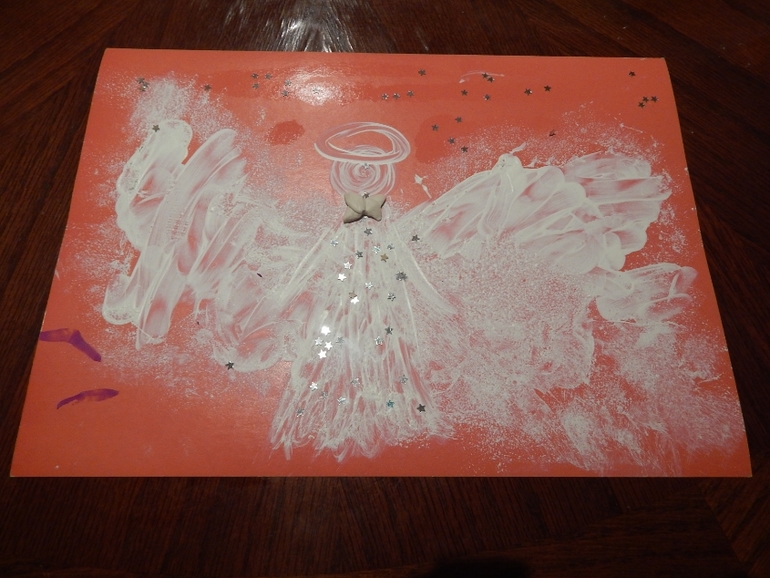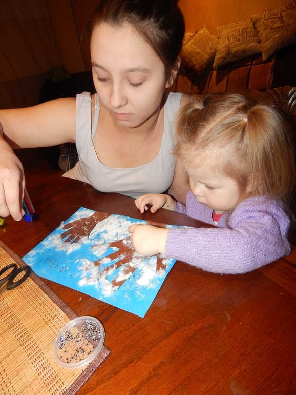И немного позанимались творчеством: сделали аппликацию "Зимний лес" и "Рождественский ангел" (Славушка рисовала крылья, а Варюша дорисовала самого ангелочка):