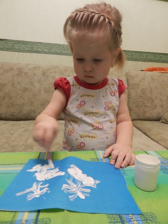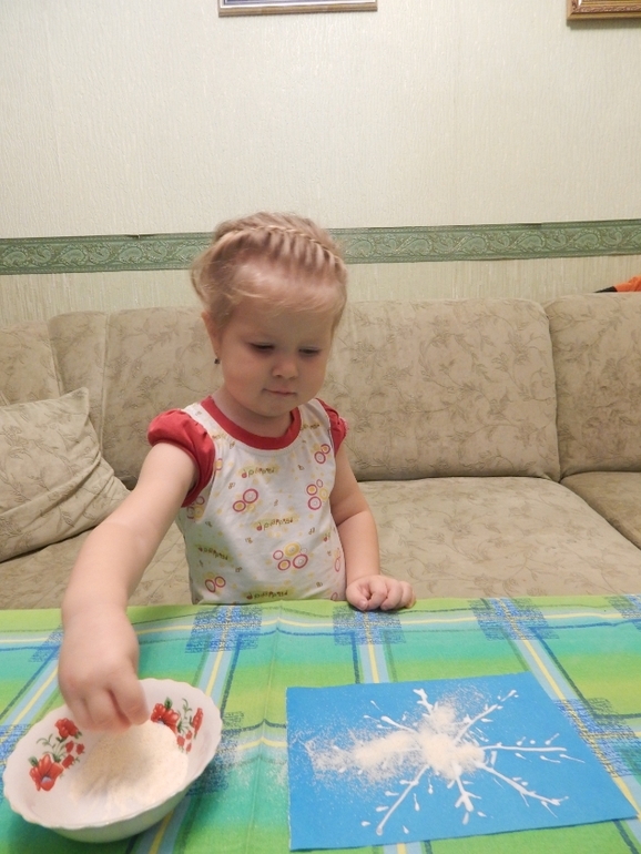 Рисовали снежинки и метель, делали аппликацию манной крупой:![]()