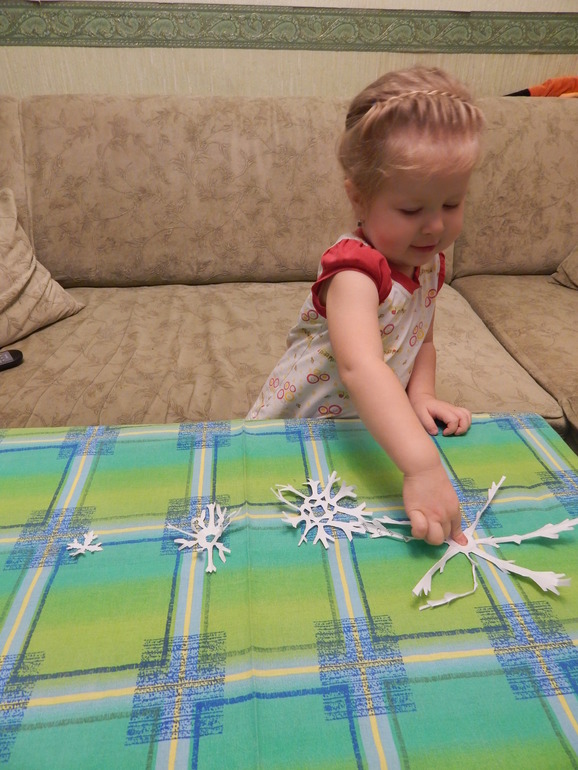 Дома поиграли в игры: раскладывали снежинки от маленькой к большой, считали их: