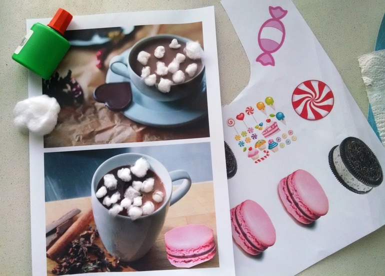 Мы любим делать аппликации с ватой: снег на ёлке, дым Паровозику из Ромашково, шерсть барашку, морскую пену, облака, мороженое и много другого. Сегодня у нас какао с маршмелоу, орео и макаронсом. Соотношение затраченных мамой усилий на подготовку (нагуглить пару чашек какао и десертов и распечатать их) и пользы для ребенка - идеальное! Ребенок тренирует мелкую моторику, пока катает шарики ваты, ставит аккуратные капельки клея и самостоятельно вырезает сладости. Одно плохо - после занятия от вас потребуют вкусненького:)
