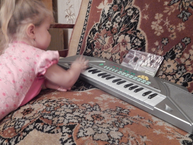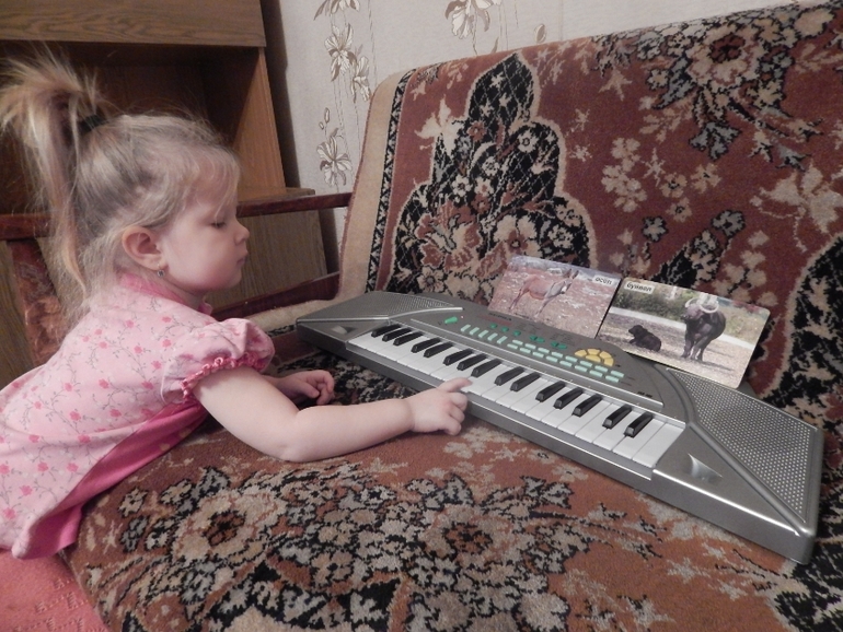2. Играем на музыкальных инструментах (синтезатор, барабаны, ложки, маракасы, иногда достаю гитару - перебираем струны, т.к. сама помню всего 2-3 аккорда). Предлагаю разные игры с инструментами. Например, берем карточки с животными («Мир на ладошке» темы «На лесных тропинках», «Удивительные животные», «Домашние животные», «Мир джунглей»), я показываю какое-нибудь животное и прошу Славу изобразить его на синтезаторе. Так, дочка уже знает, что крупные животные, например, медведь, лев, бегемот рычат громко и низко, поэтому нажимает клавиши октавы нижнего регистра, а маленькие животные (мышки, ежики, белочки) - «живут» на октавах высокого регистра. Эта игра ей очень нравится!