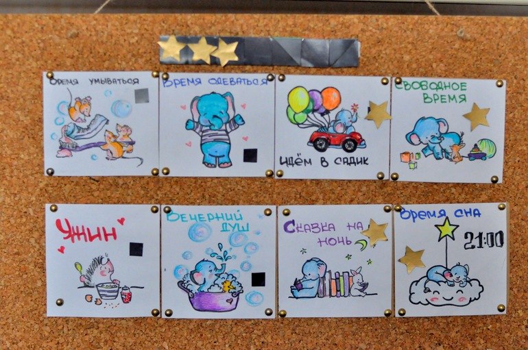 К каждой картинке приклеен маленький квадратный манитик, если ребёнок выполняет это дело, то он прикрепляет звездочку, которая тоже на магнитной основе, тем самым отмечая, что done ✅