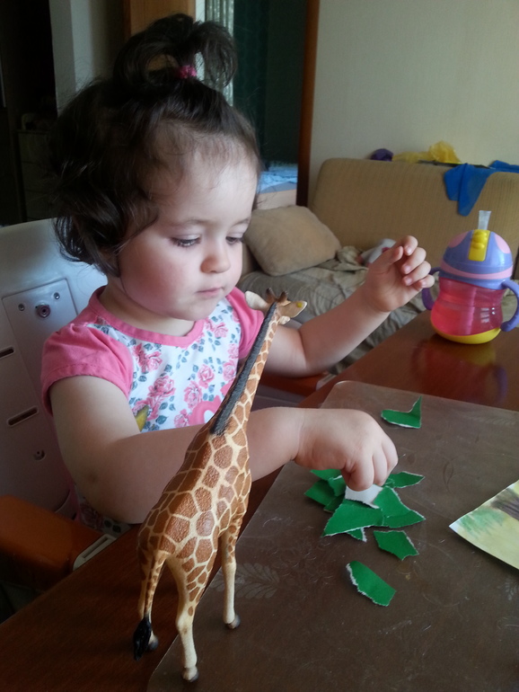 Предложила приготовить листики из зеленой цветной бумаги и покормить жирафа. В итоге рвала я, а дочка с удовольствием кормила. Покормить и уложить спать это пока единственное, что дочка делает с фигурками животных.