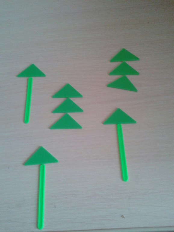 Из зеленых треугольников и счетных палочек делали деревья, считали их.