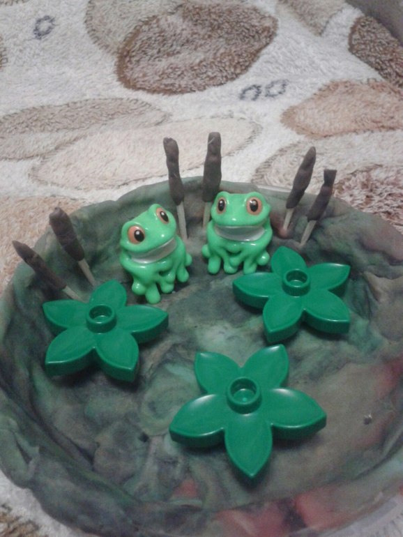 Слепили из пластилина и теста болото для двух очаровательных лягушек. Потом под песенку про лягушат попрыгали, как лягушки и просто потанцевали..