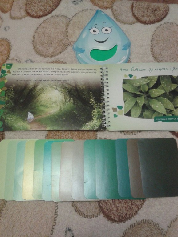 По доброй традиции пришла к нам Капелька из и рассказала о зеленом цвете, о том, какой он многогранный. Показала оттенки зеленого и рассказала, где они встречаются. Пособирали дома игрушки зеленого цвета, подобрали к ним карточки соответствующих оттенков. Еще попробовали разложить оттенки от светлого к темному. Почитали цветной альбом из «Творчества», выполнили подборку интересных заданий.