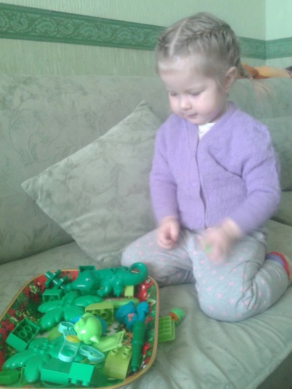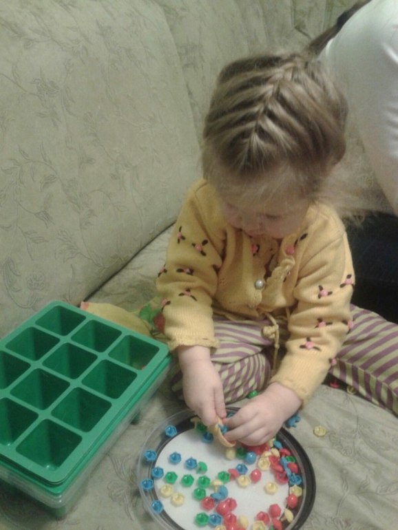 Задание на развитие моторике: ложечкой выбирали зеленые детальки из мозаики, раскладывали по стаканчикам. Сначала мой усидчивый ребенок старательно выполнял задание, потом ей это дело надоело, начала загребать все цвета подряд)))