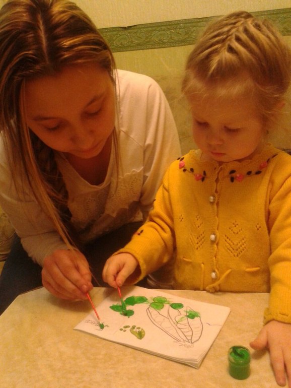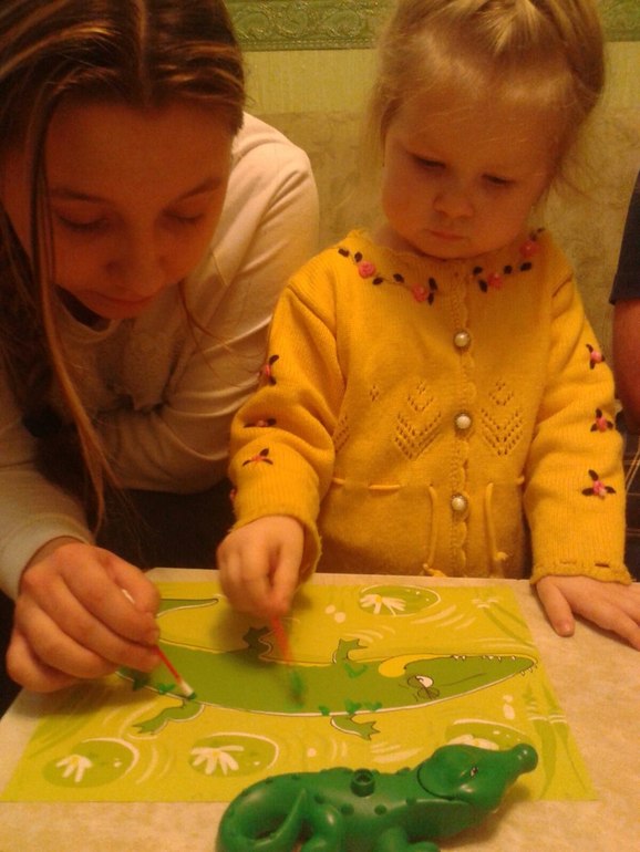 Вместе с двоюродной сестренкой Варей Слава делала крокодилу шипы (арт-лист из комплекта от Умницы). Остановиться не могли на этом и пораскрашивали зеленые овощи в раскраске.