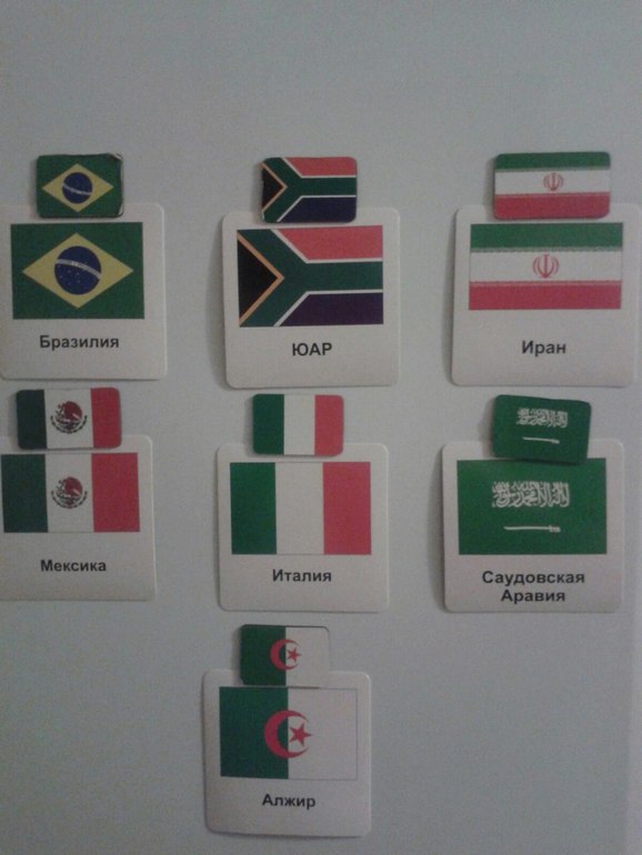 На десерт оставили любимые флаги. Я заранее отобрала флаги с зеленым цветом, на холодильнике развесила соответствующие магниты. Задание следующее: Слава подбегает ко мне, я даю ей 1 флаг и она быстренько бежит к холодильнику и ищет соответствующий магнитик. Нашла-прицепила. Бежит за следующим… как всегда доставили много удовольствия и мне, и моей сладкой малышке)))