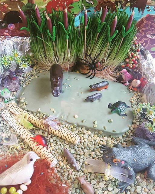 Сенсорная коробка "На болоте" с использованием неньютоновской жидкости (крахмал +вода + пищевой краситель) .В нашей коробочке дополнительно было использовано: проросший овес, камыши из пластилина, цветы и ягоды на проволоке, зеленый горох, камни, брусочки, сизаль, фасоль, фигурки животных, насекомых и птиц.
