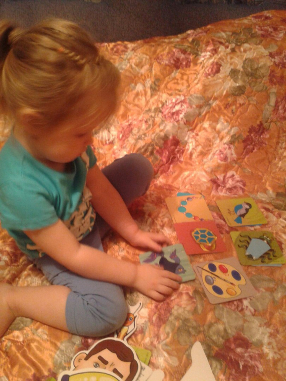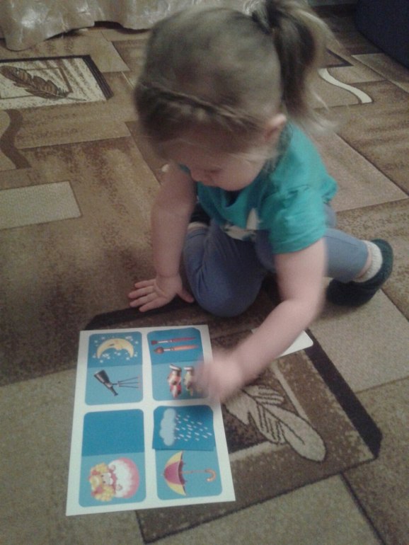 Собирала Слава лото, соотнесла легко: краски-кисточки, телескоп-месяц, зонтик-дождик, кукла-расческа.