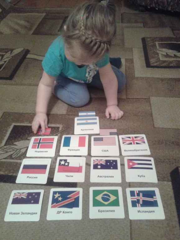 Поиграли с флагами: нашли флаги, где есть синий цвет, разложили на них соответствующие магнитики, повторили название стран.