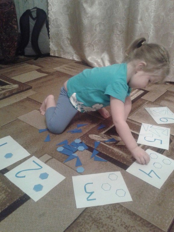 перешли к математике и геометрическим формам. Также задание каждому числу положить нужное количество фигур.