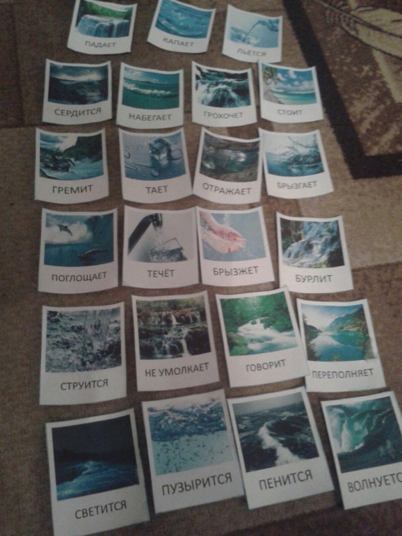 Рассмотрели карточки-прилагательные и глаголы темы «вода», обсудили, какая вода бывает..