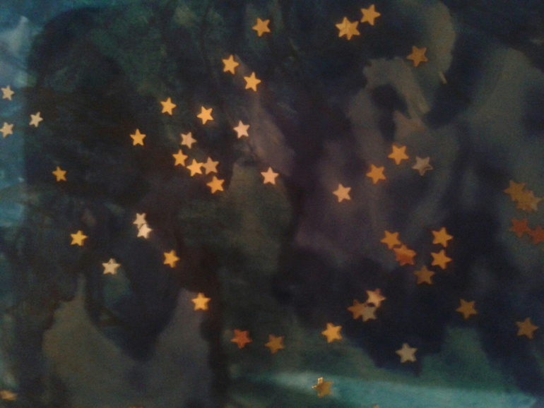 На листах позанимались творчеством. Получилось ярко и красиво. Еще рисовали ночное небо с яркими звездами. Спели колыбельную, выключили свет, понаблюдали за тенями. Немножко поиграли с тенью))