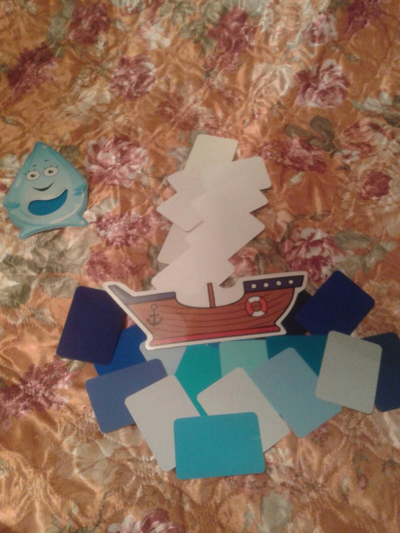 Ладно, ближе к делу. Совместили мы голубой и синий, но каждому цвету уделили достаточно внимания. Как обычно, наши цветные занятия начались с прихода Капельки, которая принесла нам цветной альбом и много разных оттенков синего цвета. Какой же синий цвет многогранный! Восхитительные оттенки от самого светлого до глубокого темного… Очень долго играли с трафаретами из , фантазировали, что может быть такого цвета.