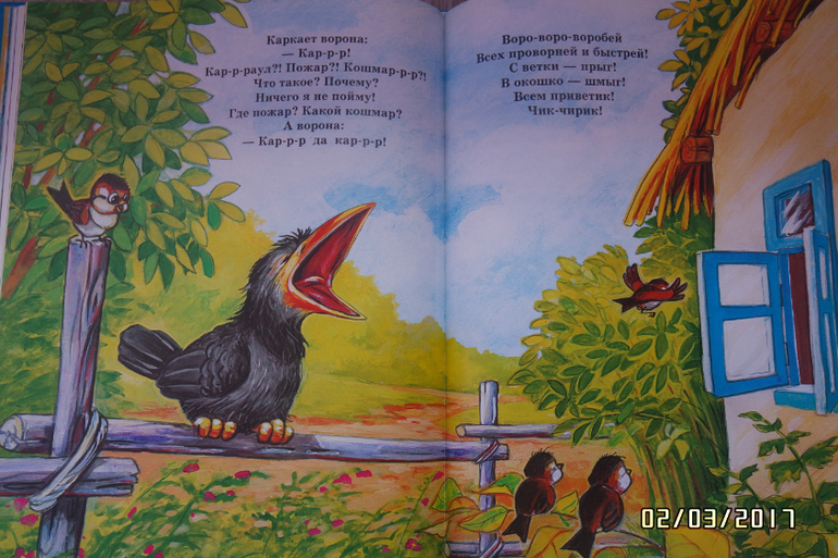 На каждом развороте две шикарные иллюстрации : одна черно-белая,другая - акварельная. Рисунки очень завораживают. Всем малышам советую.
