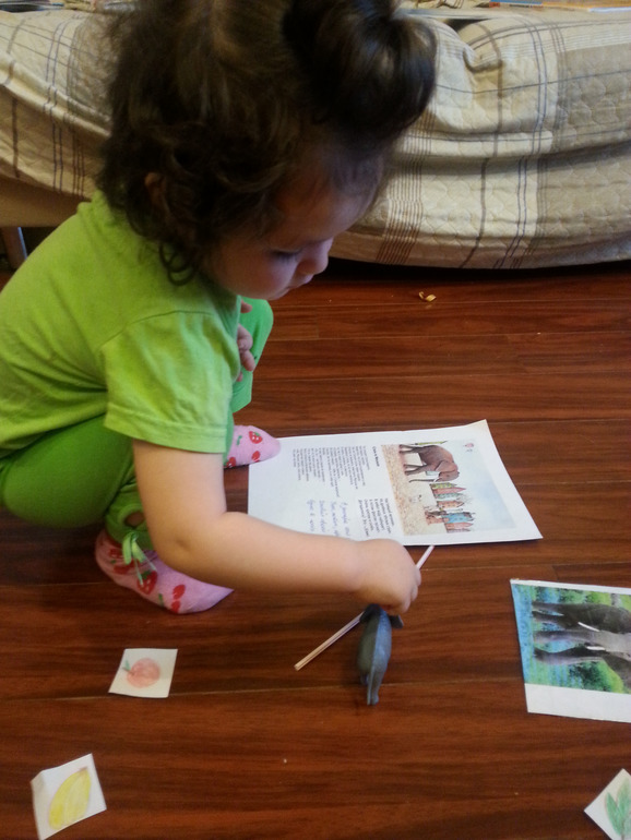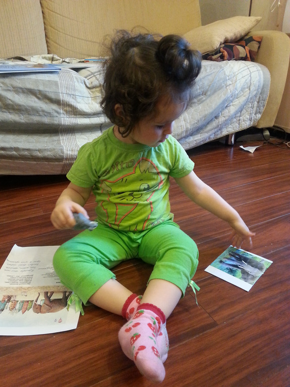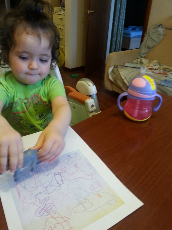 Потом искали на рисунке спрятавшегося слона. Дочка сама не нашла (трудновато, наверное). Я показала и она поставила туда фигурку слона.