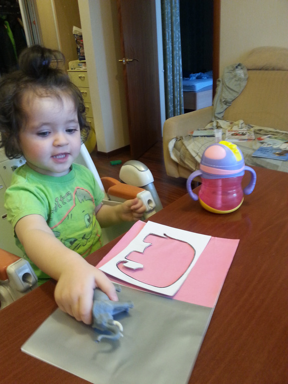 Дальше, мы слушали песню «Розовый слон» и играли с трафаретом. Идея взята отсюда . Заодно потренировали розовый и серый цвет. Серый нам уже давно знаком, а розовый мы еще путаем. С трафаретом играли и в дальнейшем, я называла цвет, а Лизок искала и прикладывала слоника.