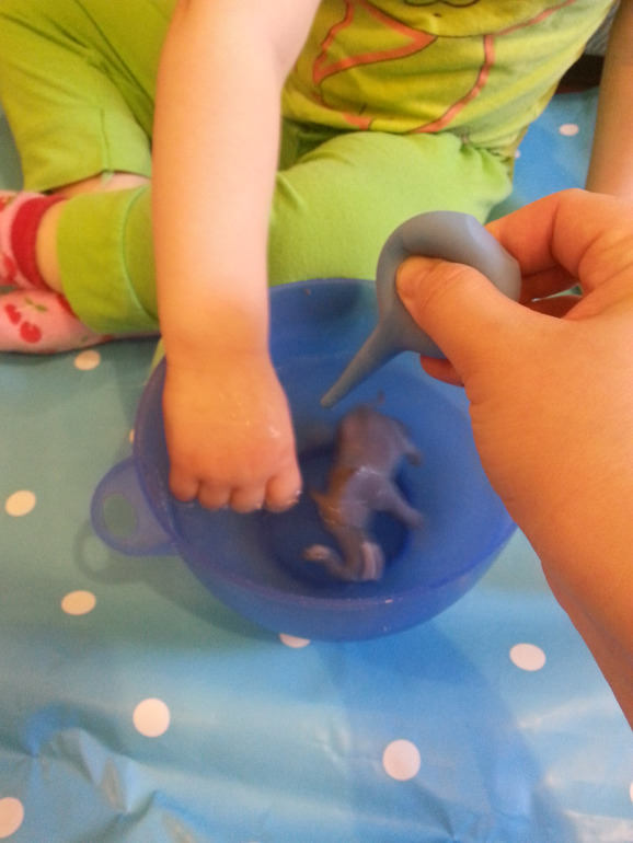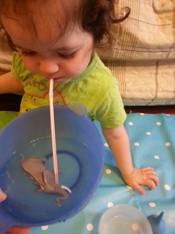 Я продемонстрировала с помощью резиновой груши, как слоник набирает воду в хобот, а потом или пьет или обливает себя. Сама, Лиза, это пробовать не захотела.