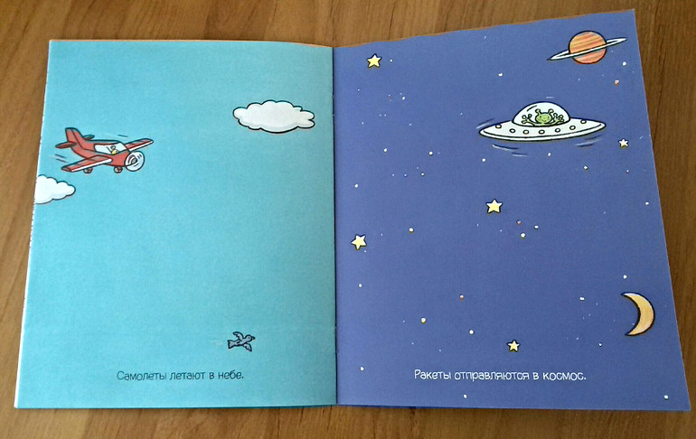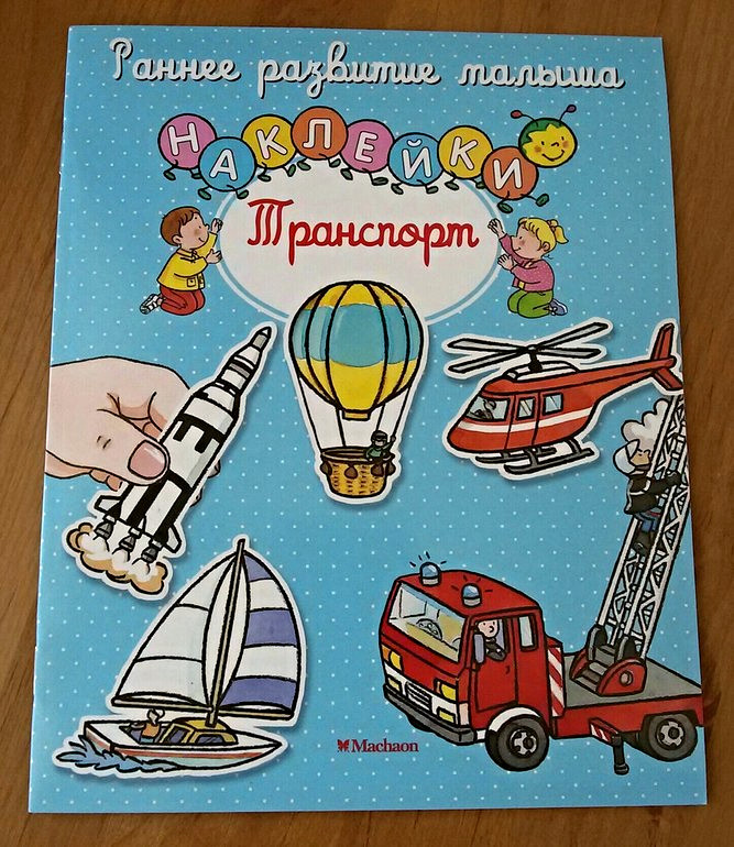 Вот она маленькая голубенькая с машинками. Брала ее на пробу. Наклейки в ней тонкие, одноразовые. Но неожиданно книжечка стала забавой для двух детей. Не смотря на шрифт, старшая теперь читает ее братику, а тот слушает внимательно, пальчиком тыкает. Надо купить еще парочку.
