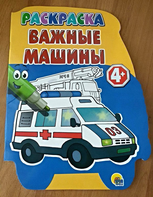 Эту раскраску сын схватил в магазине. На все просьбы поставить ее на место, он отрицательно мотал головой и упорно тащил меня за палец к кассе. Хоть и заявлено на ней 4+, машинки изображены крупно, по одной штуке на страницу. И поскольку нам на пустом листочке калякать не интересно, подавай нам различный транспорт и чтоб колеса побольше, то нашим целям и возрасту она вполне соответствует. Да и четырехлетняя сестренка свою руку приложила)))