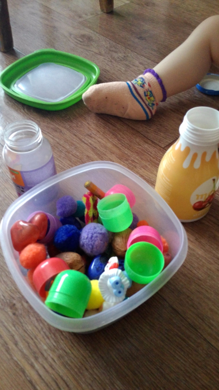 3. Сенсорные коробочки. До года ещё делала коробочки из манки, риса крашенного и гидрогеля. Сейчас уже не делаю, так как дочка целеноправлено раскидывает везде. Но как минимум достаю раз в день либо коробку с киндерами старшей дочки, либо вот такую сенсорную коробочку с камнями и помпонами, к ним 2 баночки. Ребенок может раскладывать минут 10-15, для нас это прям максимум, так как младшая совсем не усидчивая.
