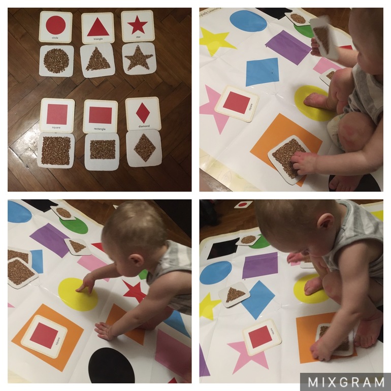 Развитие детей второго года жизниВ наших занятиях нет никакой зубрёжки) Только безудержное веселье) На видео маленький кусочек занятий по skylarkenglish https://www.youtube.com/watch?v=HQ0lEArvM8s&feature=share . Изучаем формы. Я показываю Мирославу карточку с фигурой, он ее смотрит, кидает, наш друг-skylark аплодирует) А Мирослав, прям заливается) А вообще, началось все с того, что я решила сделать свои собственные карточки с фигурами. Нарезала картон, закруглила края, нарисовала формы, намазала клей и посыпала гречкой. Идея, стара, как мир. Не помню точно, у кого ее а первый раз увидела. Поучилось очень круто. Сначала, мы сравнили гречневые карточки и обычные, Потом мы достали плакат с фигурами и формами. Раскладывали карточки по нужным фигурам. Мирослав очень любит звезду, всегда самую первую ее находит. Брал гречневую звезду и клал ее по-очереди на каждую звезду плаката. К концу игры, гречневые карточки обсыпались, какие-то Мирослав поковырял. Наверно, надо было клеить на супер-клей. Я переделаю их, но это был последний раз, когда я делаю какие-либо материалы своими руками. Столько заморочек и времени. Уж, лучше купить. Я пока все это создавала, Мирослав бегал под ногами и требовал внимания. Хорошо, что муж дома, пошёл читал с ним книжки. В общем, лишать ребёнка внимания, когда он его просит, потому что ты ему развивашку готовишь - абсурд. А я ещё хотела овощи и фрукты из полимерной глины сама сделать. Да, ну. Заниматься приятно на всём готовом)
