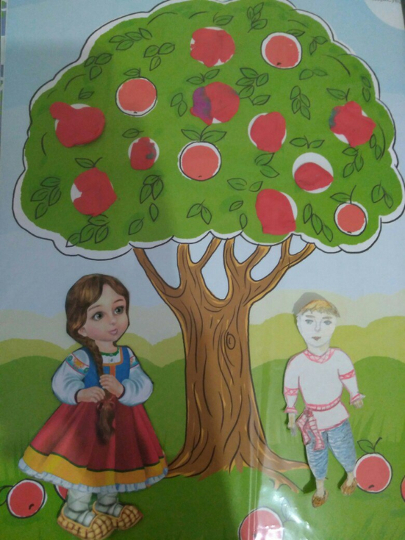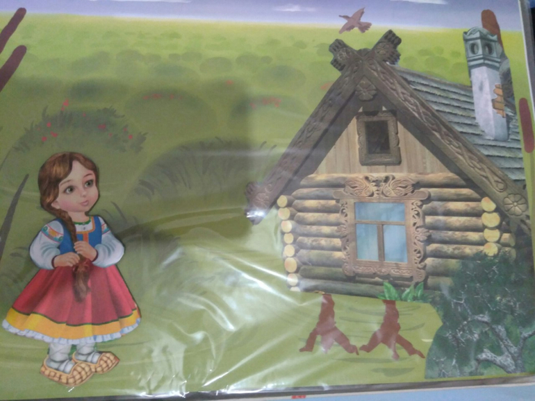 В папку-скоросшиватель вставили листы: Слава рассказывала сказку, а я собирала нашу книгу, следуя ее рассказу. Затем пересказывали еще раз, но уже перекладывая Алёнушку на каждый лист и рассматривали детали на картинках.