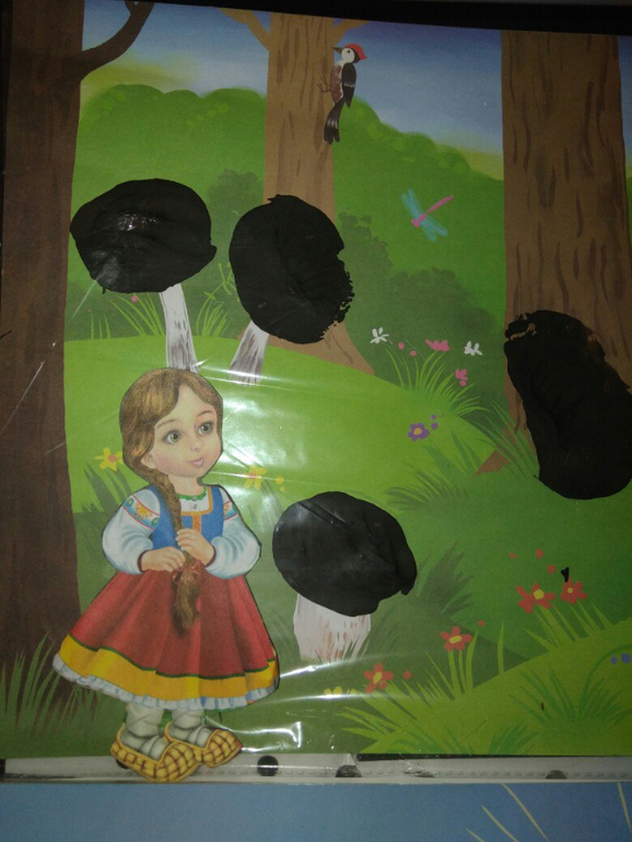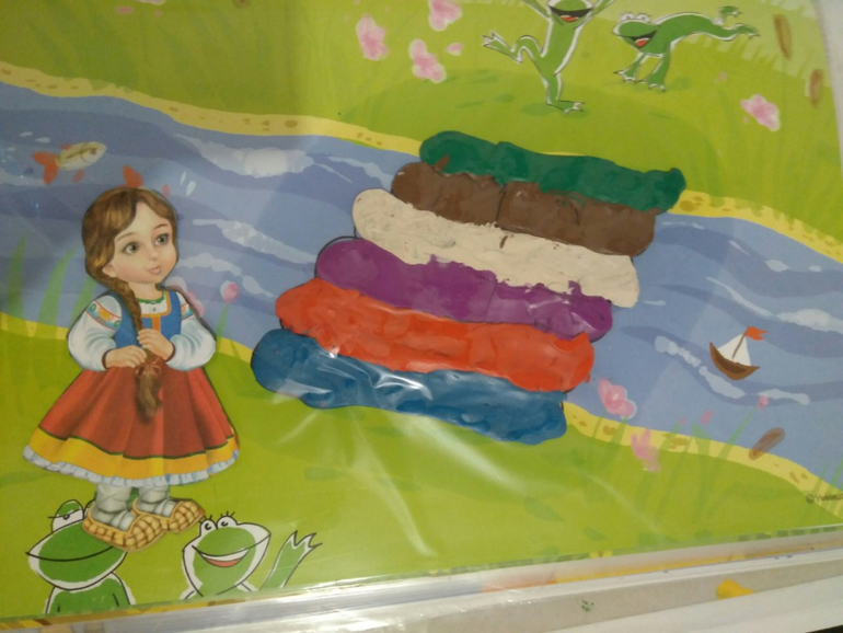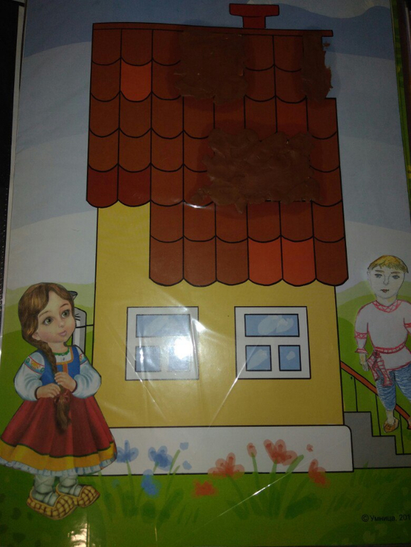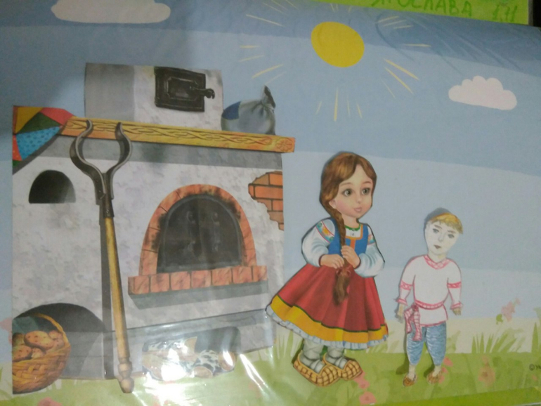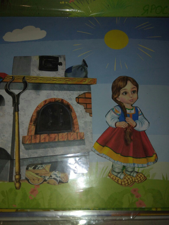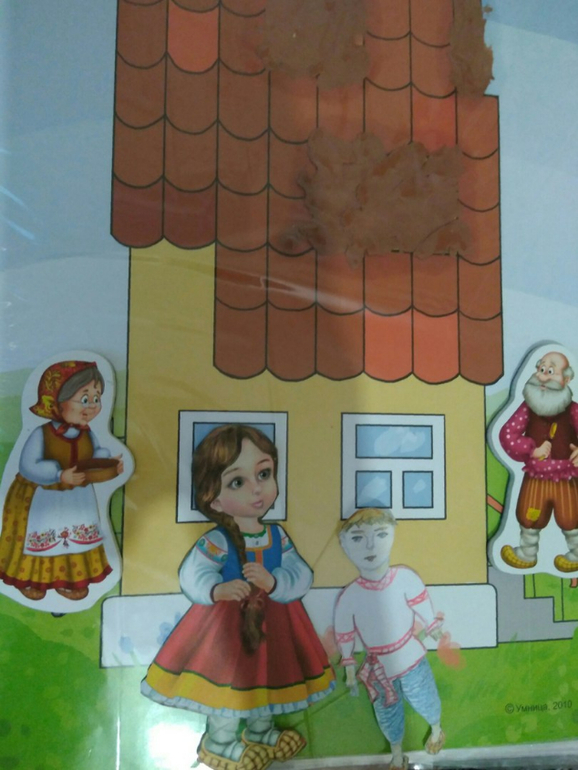 Мы с дочкой очень много занимаемся творчеством. Практически каждый день стараемся сделать какую-нибудь поделку или аппликацию, порисовать или полепить из пластилина. Я достала папку с нашими работами и мы стали искать подходящие для иллюстрации сюжета рисунки. Нашли почти все, что нужно (спасибо арт-листам "Мои первые шедевры" от Умницы). Сделали только картинки с печкой, избушкой на курьих ножках, вырезали главных героев.