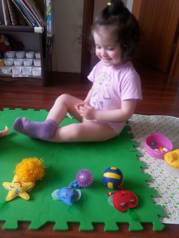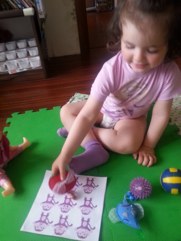 Дальше я попросила раздать мягкий помпон, резиновый и колючий мячик нашим Эмоциям (Радости, Злюке и Грустинке). Я думала, что Злюке достанется колючий мячик, т.к. дочка явно напрягалась, когда трогала и слушала про Злюку. Но нет, ей выдала резиновый и гладкий мячик.