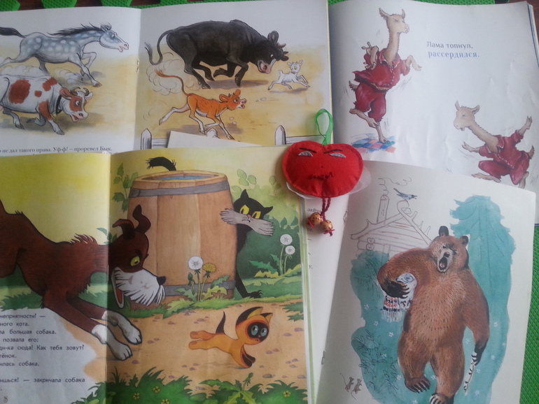 Вспомнили к кому из книжных персонажей прилетала Злюка. К несравненному Ламе - красной пижаме; к Корове, Быку и Лошади из Козленка, который умел считать до десяти; Медведь очень разозлился, что его не пустили в Баню из одноименного стиха; и Пес разозлился на Котенка по имени Гав, подумал, что он его дразнит.