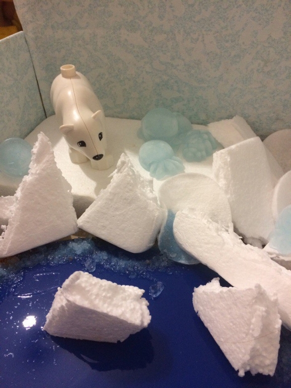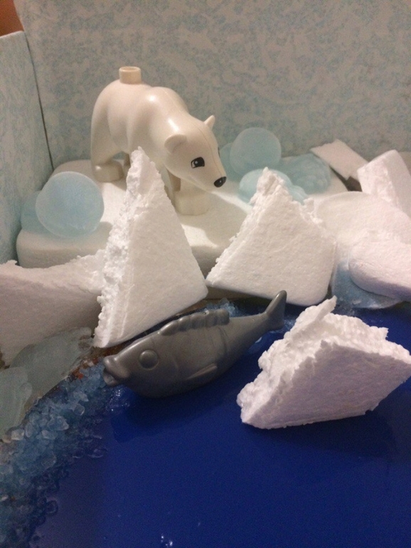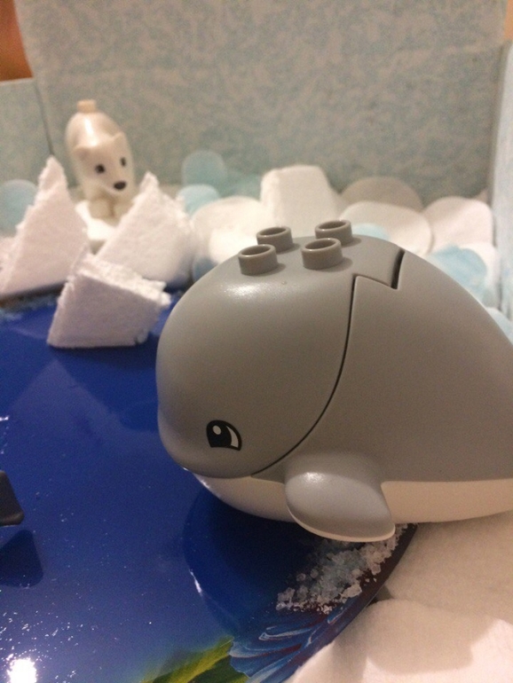 Дальше я достала заранее приготовленную сенсорную коробочку. Океан сделала из желе, ледники из пенопласта, снег из морской соли, добавила чуть подкрашенный лёд. Животные - из Лего дупло. Дочка была в восторге! Играли долго)