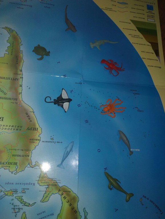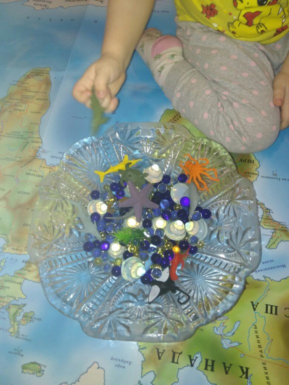 Сначала достали карту из и нашли на ней Тихий океан. Я рассказала основные факты о нем. Сделали небольшую сенсорную коробочку из стеклянных камушек двух цветов и стеклянных ракушек. Спрятали в них обитателей Тихого океана. Слава их выискивала, доставала и называла, кто есть кто.