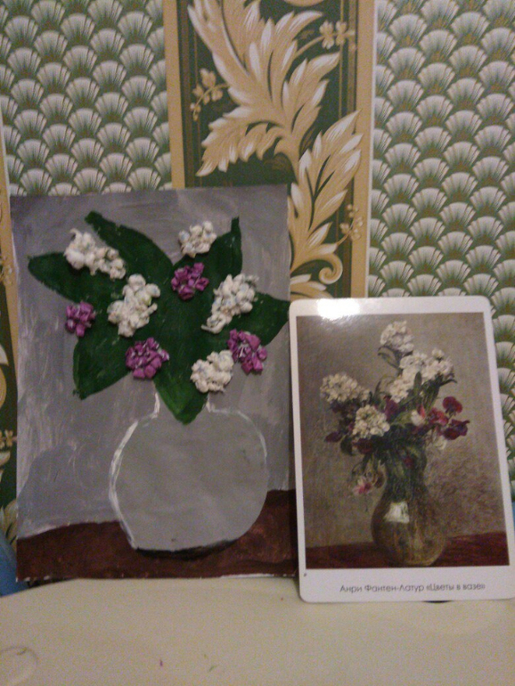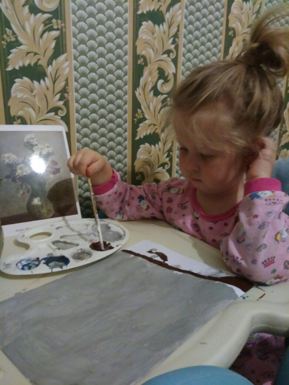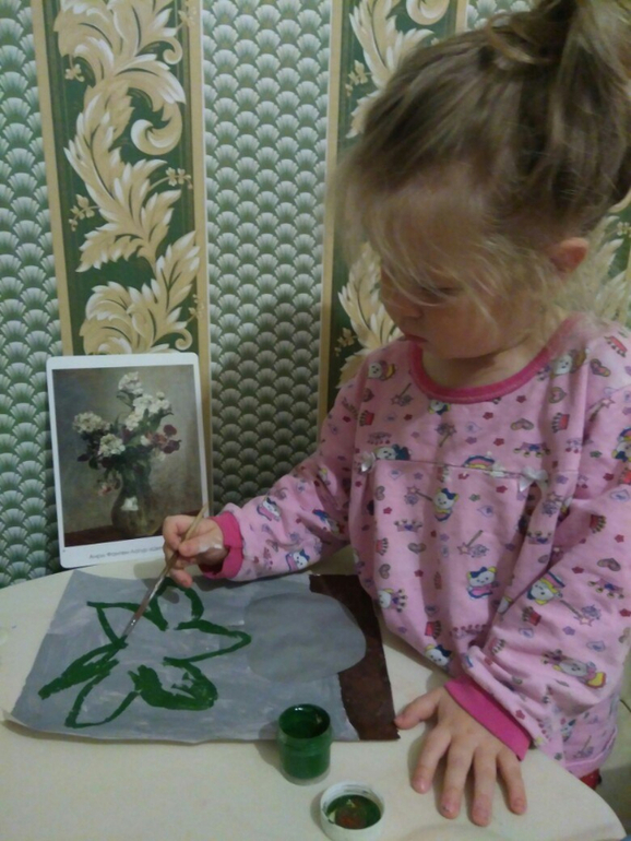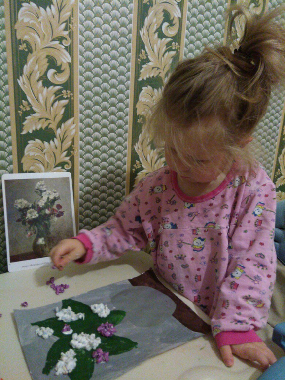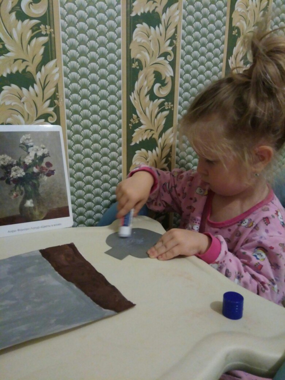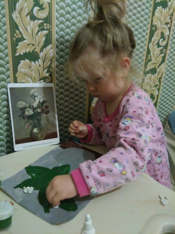 Художественно-эстетическое развитиеДавно не доставала . А сегодня вечером Слава попросила порисовать вместе и я решила совместить приятное с полезным) Из комплекта выбрали картину художника Анри Фантен-Латура «Цветы в вазе», рассмотрели ее и обсудили, что на ней изображено. И начали творить) Я безумно рада, что с каждым занятием дочка проявляет больше старания, почти все делает сама. Я объясняю, что нужно делать, готовлю материалы, а Славушка красит и клеит. Вот такая красота у нас получилась сегодня: