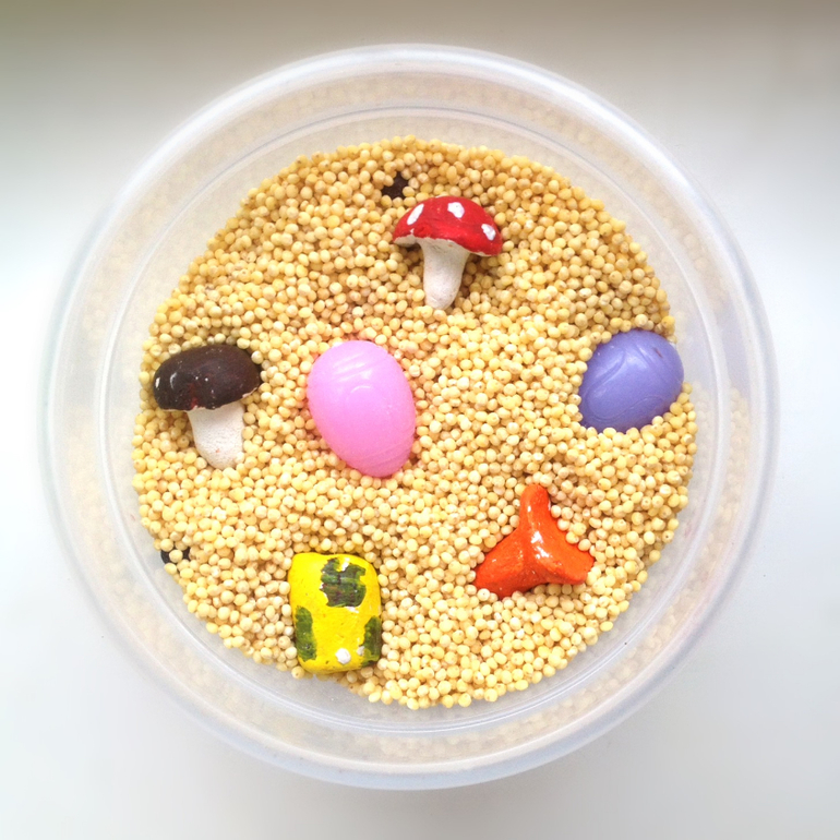 Из пшена вылавливаем мелкие фигурки. Задание очень понравилось.Тима долго копался ложечками и чашечками.