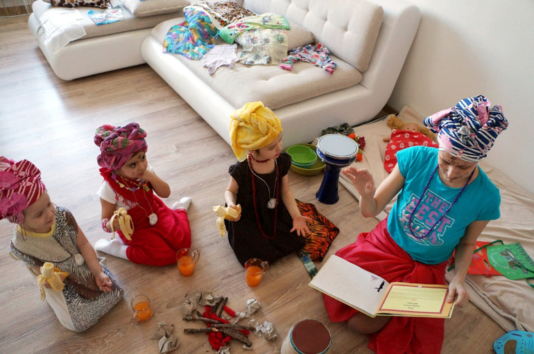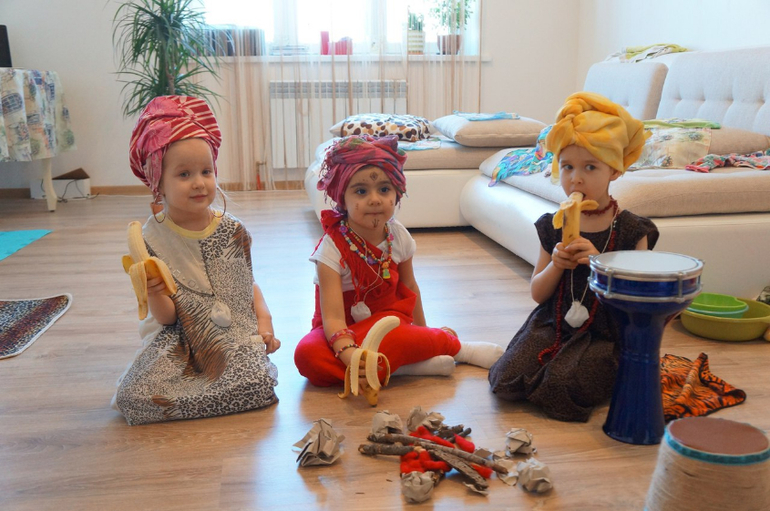 Наступил вечер и пришло время укладывать спать малышей и разводить костер.